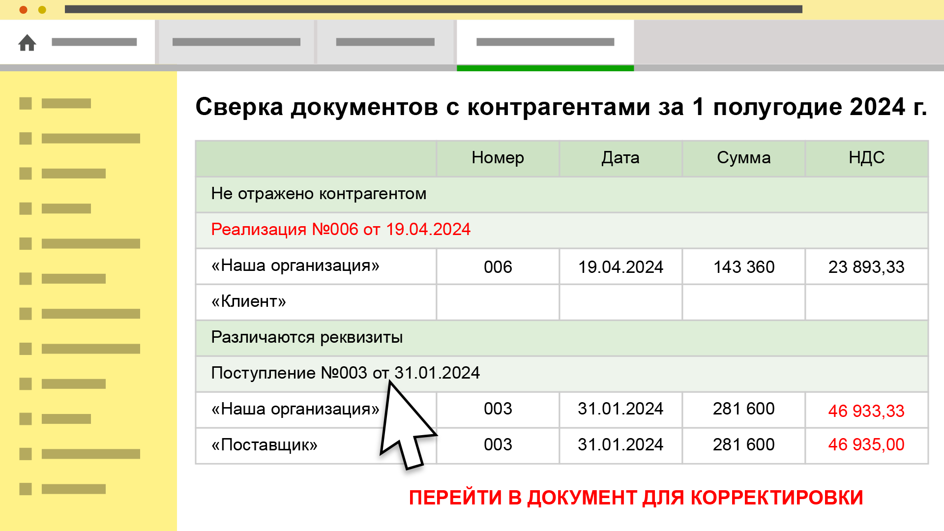 «1С:Сверка 2.0» в фоновом режиме получает данные, сверяет их и уведомляет вас о результатах – все хорошо или между документами есть расхождения. Наглядный отчет в программе 1С покажет пары документов с обнаруженными расхождениями: даты, номера документов, суммы и НДС. По каждому выявленному расхождению можно перейти в исходный документ для корректировки.