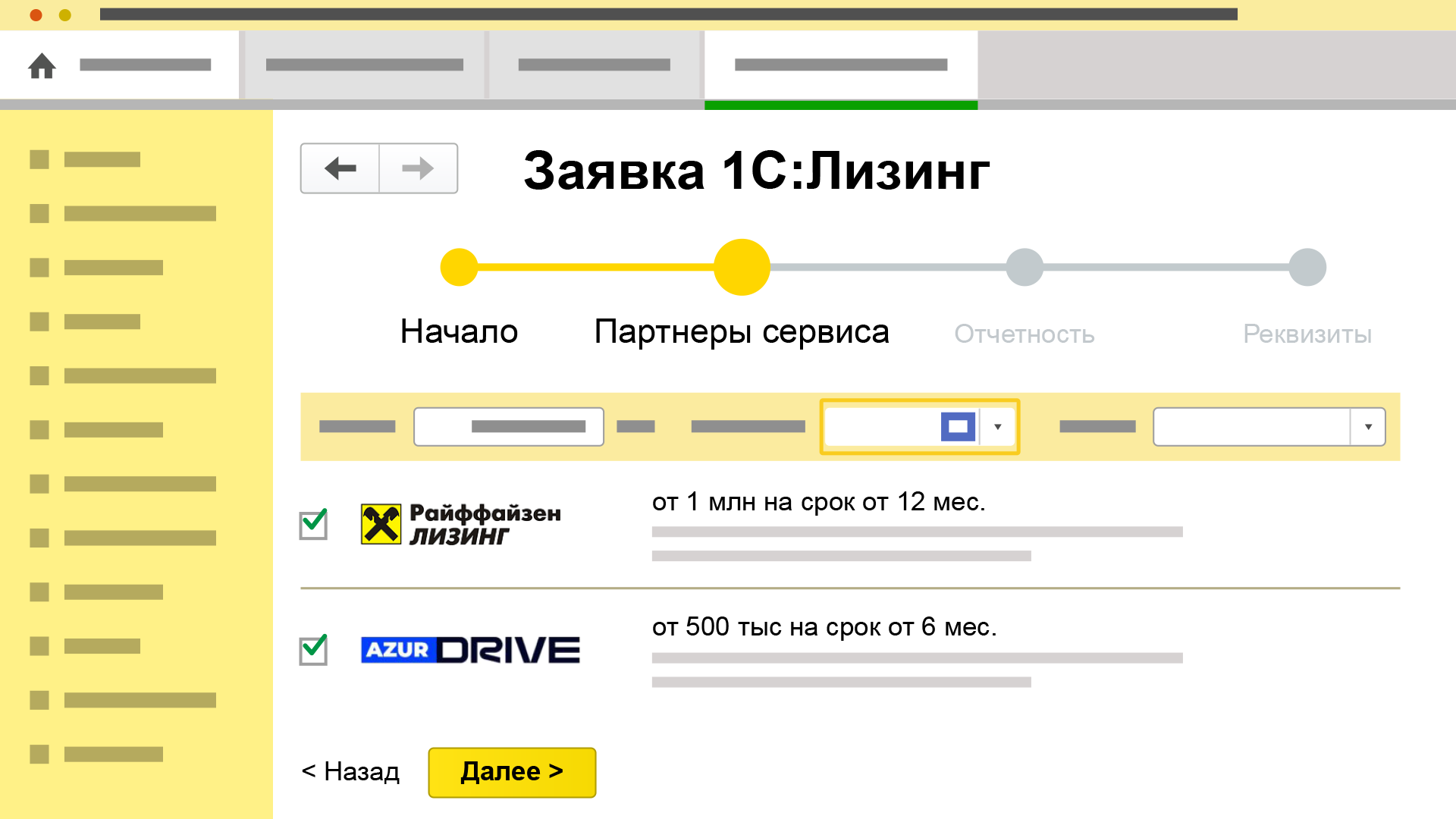 «1С:Лизинг» помогает найти выгодные лизинговые предложения и упрощает оформление заявки на заключение договора лизинга.